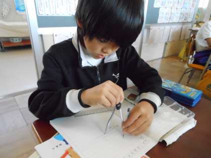 二等辺三角形のかき方を使って、正三角形のかき方を考えました。