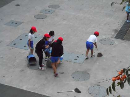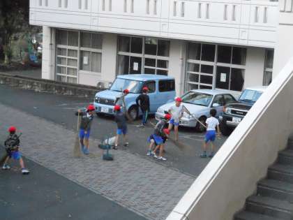 11月19日(月)の朝の愛鷹小学校 3 ボランティアで落ち葉掃き(4年生)
