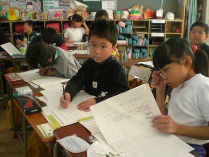 今日は、本文をよく読んで、みんなで問いの文とその答えの文を探しました。