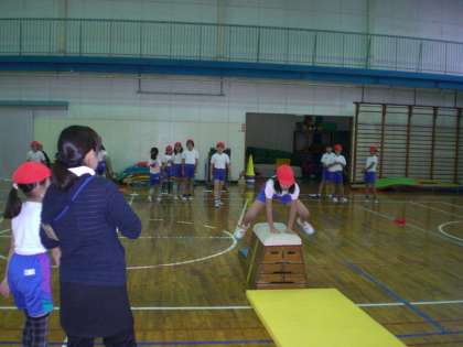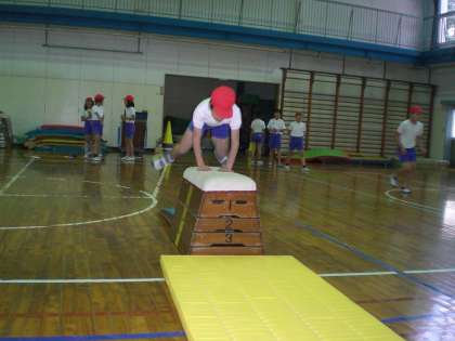 横跳び越し、開脚跳び、かかえ込み跳び、台上前転の4種目に、それぞれ目標を持って、取り組みました。