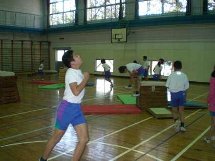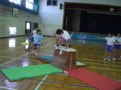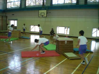 開脚跳び、開脚垂直跳び、閉脚跳びを練習しています。まだまだ上手に跳べませんが、楽しく授業に取り組んでいます。