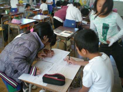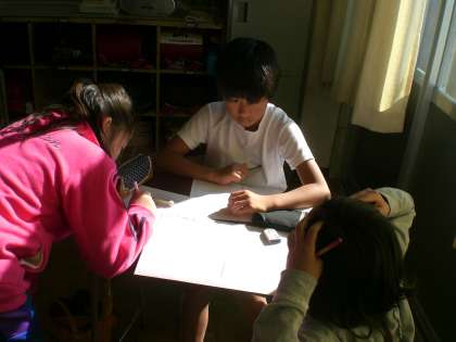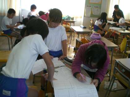 次の時間から始めるハンドベースボールの対戦ゲームに向けて、チームごとに打順や守りの場所を決める話し合いをしました。