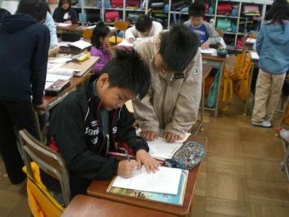 カップに入った水を1dlますに入れたとき、はしたの量をどう表すかで自分の考えを伝え合いました。