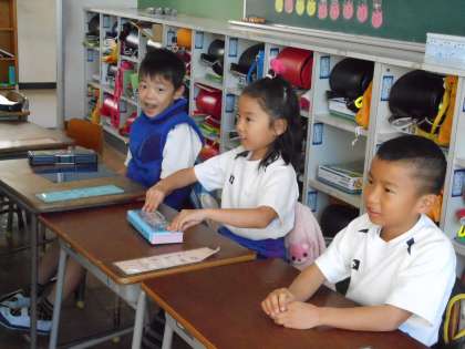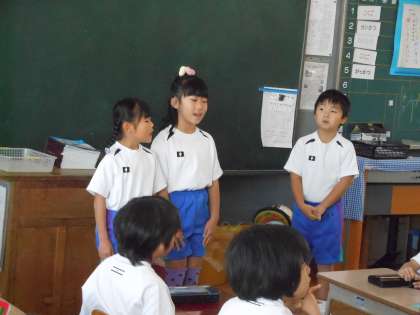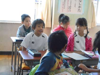 1年生の朝の会。ひとりひとりが健康状態を…。「○○さん」「はーい、げんきでーす。」