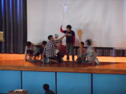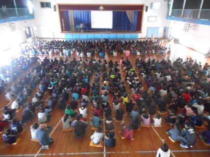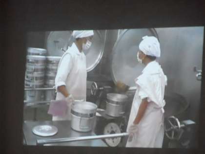 今日の集会では、普段知られざる給食室の中の様子がスクリーンで上映されました。