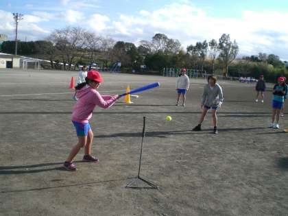攻撃と守備に分かれて、ボールをバットで打ち、得点を競うゲームを行っています。男子はピッチャーの投げたボールを打つ、女子は置いてあるボールを打つ、などルールをそれぞれに工夫して行っています。小さい球を扱うのはなかなか難しい!