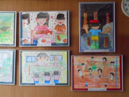 ギャラリー校長室に手もみ茶体験や給食のことをテーマにした3年生の絵画作品が3点加わりました。