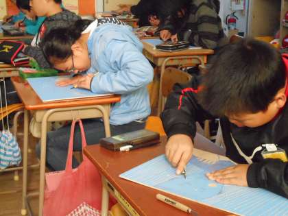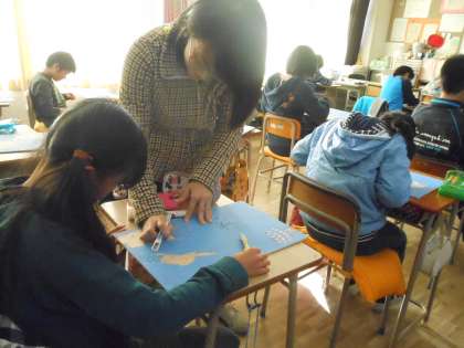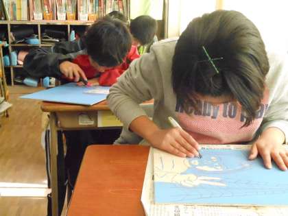 さすが6年生、彫るのには慣れていて、去年よりずっと早く彫り進められています。白と黒のバランスはどうかな?