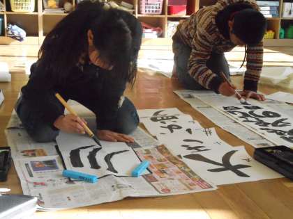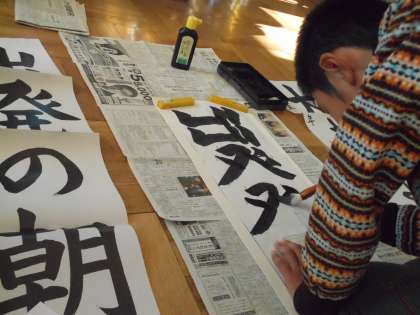 冬休みを前に書き初めを練習しました。書初め用の筆がうまく使えず苦労していましたが、のびのび大きな字を書いていました。