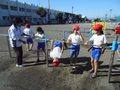 みんなで、8の字、なわとびをしてから、鉄棒の練習をしました。少しずつでも、逆上がりができる子がふえていくといいですね。