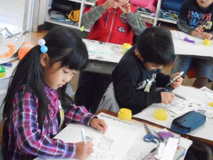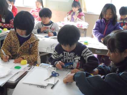 髪の毛も、画用紙や毛糸を使って一本一本つけていました。