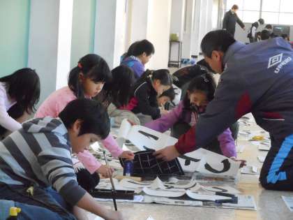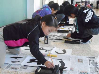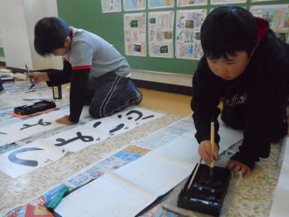 初めての書き初め『つよい心』を書きました。いつもの毛筆とは違って、悪戦苦闘する子が多かったです。