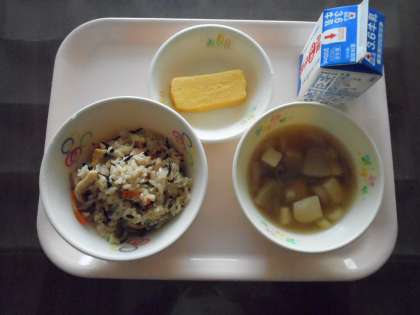 今日のメニューは、「ひじきごはん、のっぺいじる、あつやきたまご、ぎゅうにゅう」です。