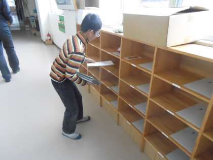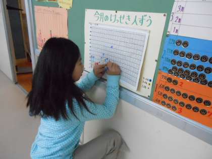 保健委員会の子どもたちが、欠席者のグラフを書き込んだり、健康観察のカードをクラスのボックスに配ったりしていました。