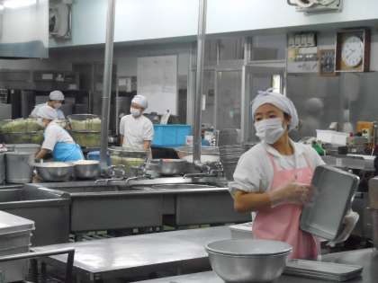 今日は2学期で最後の給食になります。調理場では「子どもたちのためにおいしい給食を作ろう」と調理師たちが張り切っていました。
