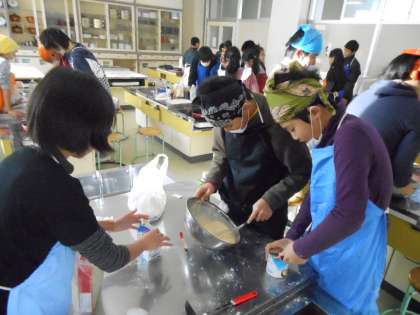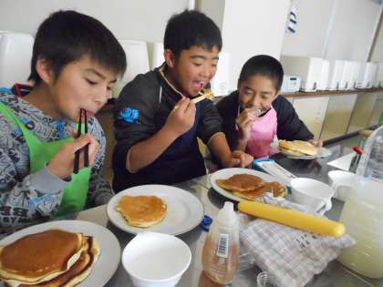 子どもたちは、それぞれのホットケーキに悪銭苦闘中です。
