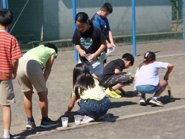 4年生理科「雨水のゆくえ」の授業の様子です。実際に雨が降ったときに水がどのように地面の中に吸い込まれていくのか実験することにしました。そのための準備として、プラスチックコップや運動場の砂や砂場の砂などをコップに入れて、実験の準備をしました。
