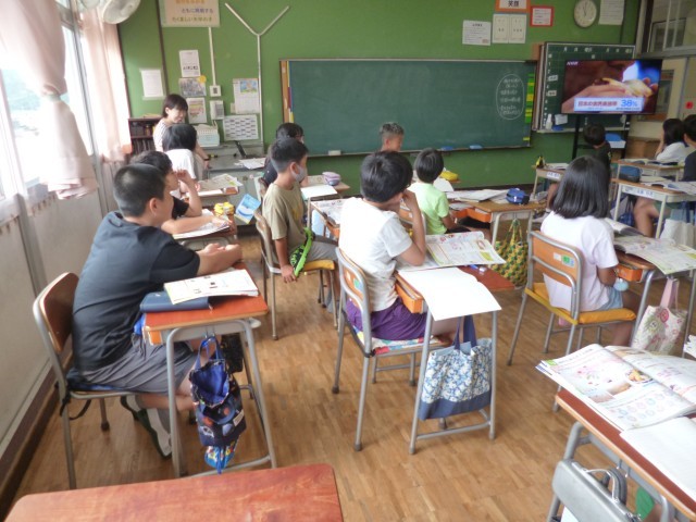 5年生社会科「これからの食料生産とわたしたち」の授業の様子です。日本の食糧自給率について学習しました。お米や野菜の自給率は高いのですが、大豆や小麦などは自給率が低く、輸入にたよっていることがわかりました。多くの国と比べて、日本の自給率がどのくらいなのかを知り、驚いていました。