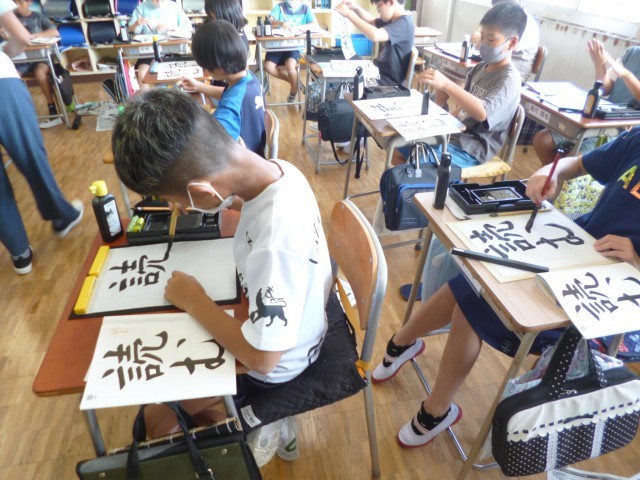 5年生書写の授業の様子です。「読む」の文字の練習をしました。筆の始筆や終筆を意識したり、ひらがなは、曲線の部分が多いので、筆遣いが難しかったりしながらも一筆一筆、お手本をよく見て、集中して書いていました。