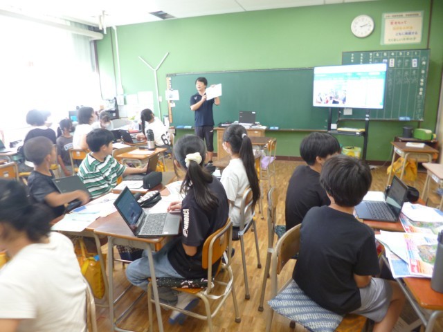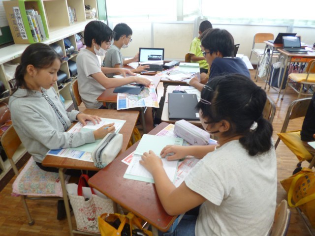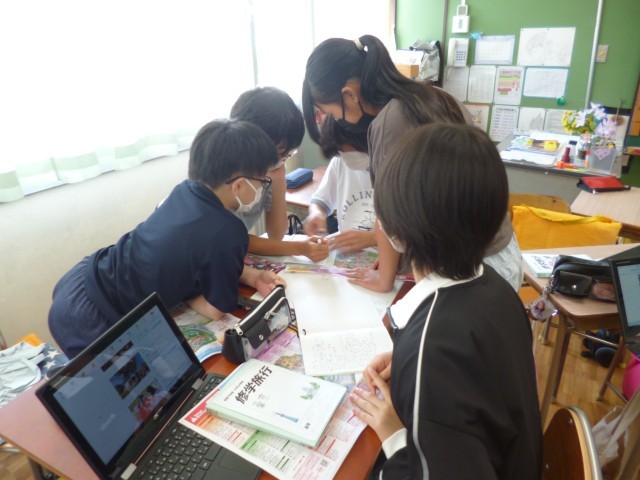 6年生が修学旅行でグループ活動をするディズニーランドでの行程表を考えました。一日目の午後の限られた時間内で、どこのアトラクションやお店を回るのか、みんなで話し合いました。アトラクションによっては、混んでいるものもあるので、待ち時間なども考えながら行程表を作っていました。