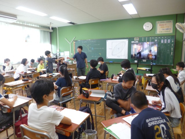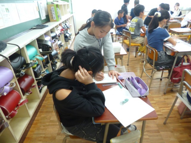 6年生算数「円の面積」の授業の様子です。円の面積の求め方を学習したので、その求め方を生かして問題を解きました。葉っぱのような形になっている図形の面積をどのようにして求めることができるのかを考えました。正方形の面積の求め方や円の面積の求め方をうまく組み合わせて、問題を解くことができました。お互いに教え合っている姿も見ることができました。