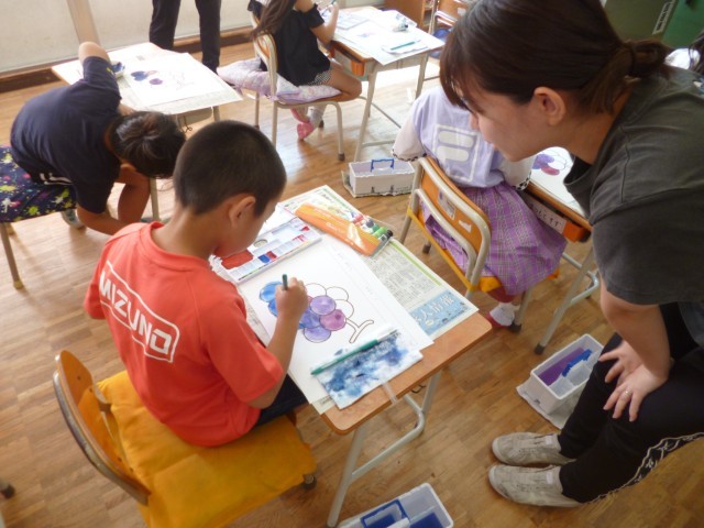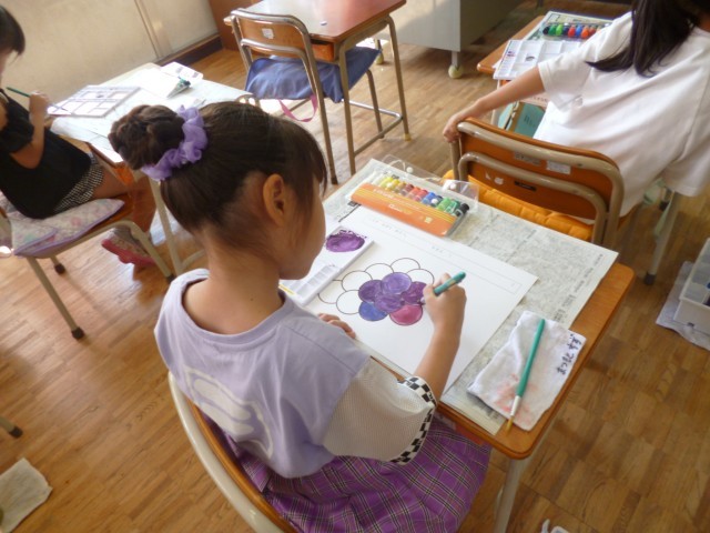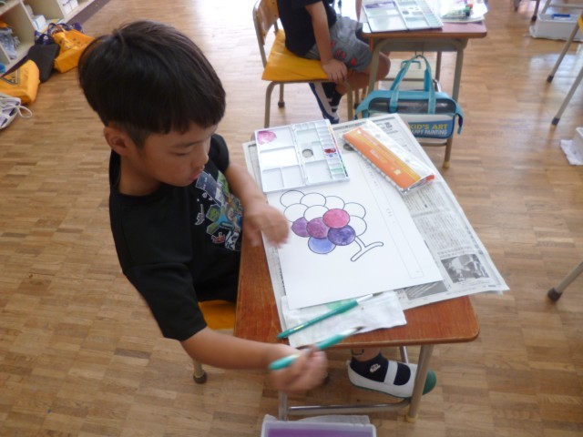 1年生図画工作科の授業の様子です。色の使い方・塗り方を覚えるためにブドウの絵に色を塗っていきました。ブドウひとつぶ、ひとつぶを少しずつ色を変えて塗っていきました。きれいにグラデーションができていて、とてもよかったです。
