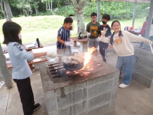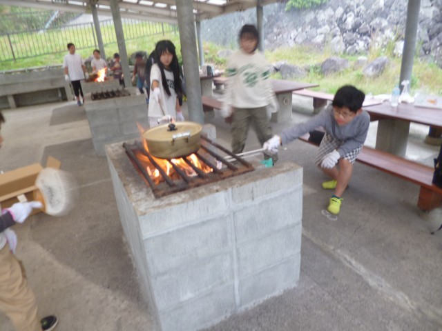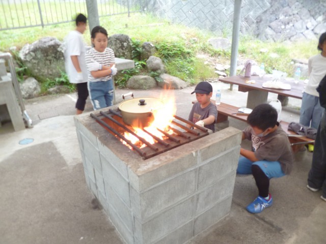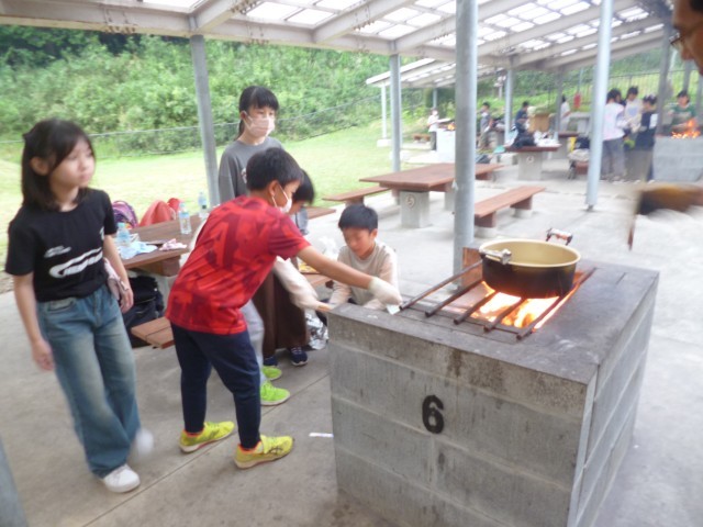 夕食作りの時間です。食事係を中心に、みんなで協力して準備をしました。お米の準備をする子、かまどの準備をする子 それぞれが自分の担当の仕事一生懸命に行っていました。 どの班も上手に火をおこすことができました。新聞紙を丸めて、わりばしや牛乳パックを切った紙、細い薪をくみ上げていき、勢いよく火がつきました。鍋にお米やレトルトのカレーも入れて、しっかりと時間を計りながら夕食作りをしました。