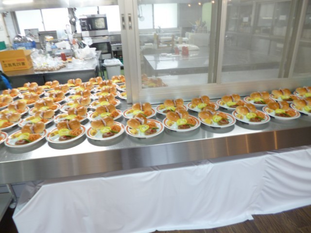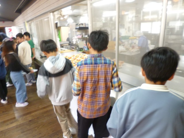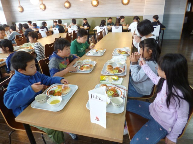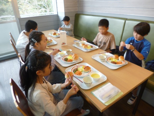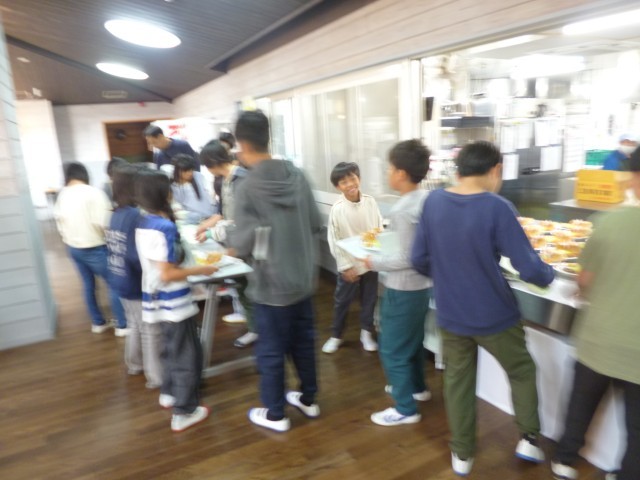 朝食は、食堂でいただきました。食事係が準備をしました。その間に準備ができている子から朝食を自分でお盆に取りはじめました。しっかりと消毒をして、全員そろった後にみんなで「いただきます」の挨拶をして食べ始めました。朝食メニューは、ロールパン2個、ハンバーグ、スパゲティー、玉子ウインナー、コーンスープでした。コーンスープをおかわりする子もいました。