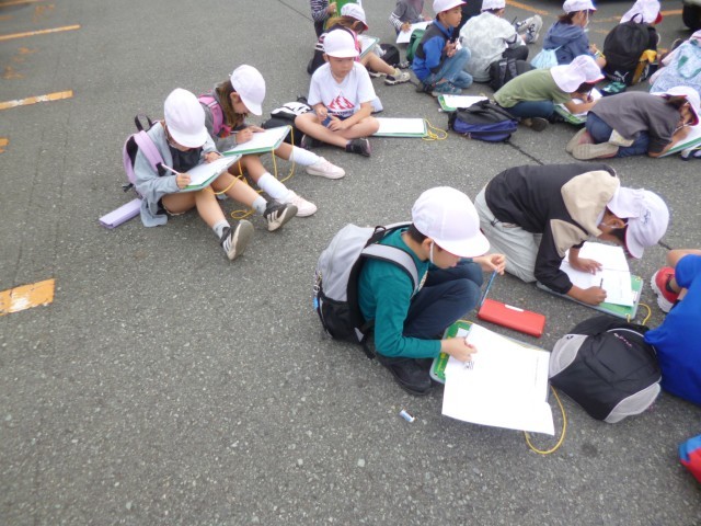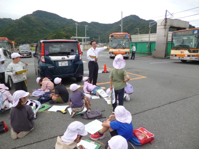 運転手さんの仕事の様子を見せていただいた後、今度は質問タイムです。子どもたちからはたくさんの質問が出ました。「バス停の数は、どのくらいあるのですか?」「バスは何台ありますか?」「運転手さんは何人いますか?」など数多くの質問を丁寧に答えてくださいました。