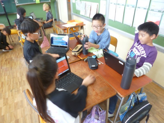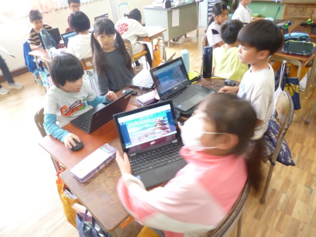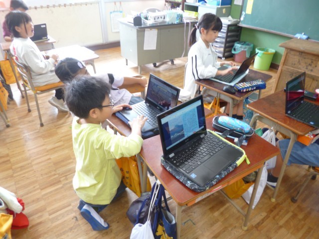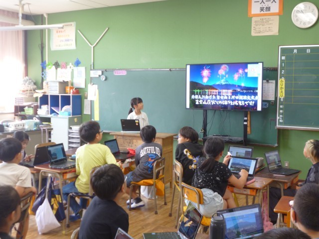 3年生読解の授業の様子です。静岡県の富士山のよさを、①外国人向けに ②山梨県に住んでいる方に ③転校してしまった友達に とそれぞれ対象が違う人に伝えるためのプレゼンテーションをChromebookを活用して作りました。それぞれの班で、一人代表者を決めてみんなの前で発表しました。どの子も、静岡県の富士山の良さを一生懸命に伝えていました。