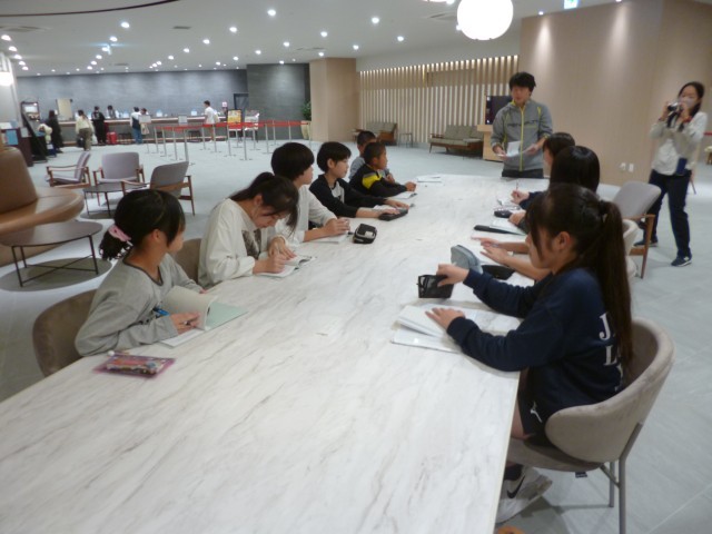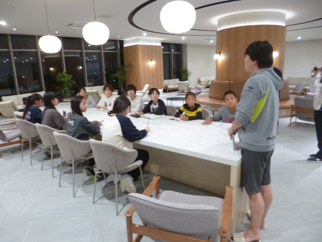 ホテルのロビーにて、班長会議を行いました。生活班の班長とディズニーランドの行動班の班長が集まり行いました。1日の行動を振り返り、よかったところ、2日目に向けて改善していきたいところなどを出し合いました。しっかりと1日の振り返りができていて、さすが班長さんだと感じました。
