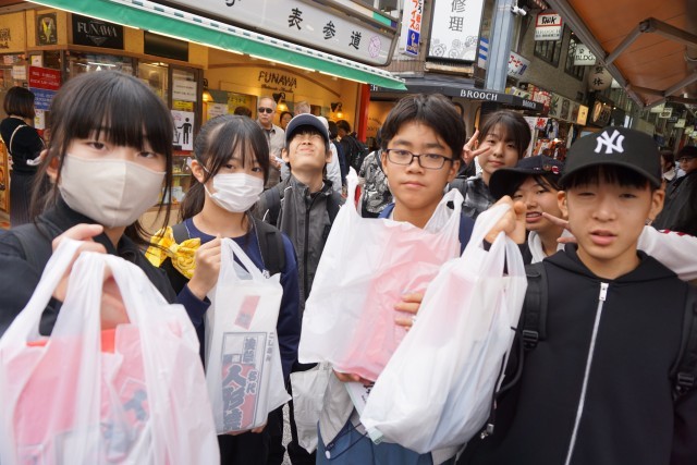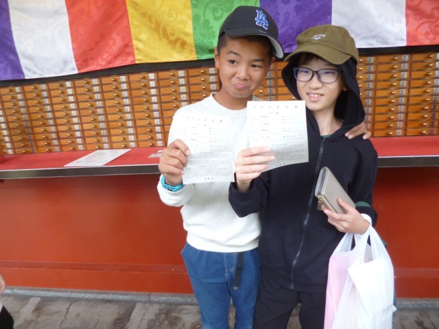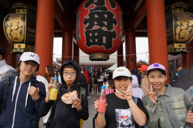 浅草の班別行動は、最初のチェックポイント、雷門での記念撮影から始まりました。班ごとに記念撮影した後は、仲見世通りを自由散策しました。たくさんのお土産屋さんや食べ物屋さんなどがありました。食べ歩きでは、ジャンボメロンパンやいちごあめ、クレープ、浅草メンチなど楽しみにしていたものを買って食べました。多くの子がおみくじを引いていました。