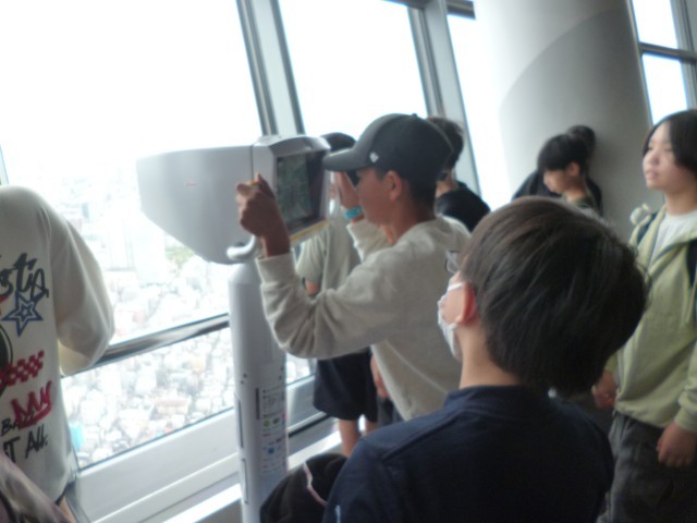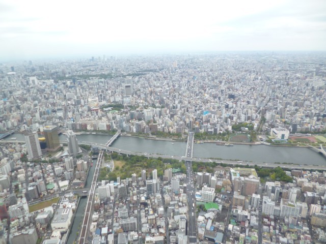 浅草を後にして、最終目的地である東京スカイツリーに行きました。展望デッキは地上350メートルの高さにあります。そこまでは、一気にエレベーターで上がりました。天気は曇っていて残念ながら富士山を見ることはできませんでしが、東京の景色は360度見渡すことができました。340メートルのフロアでは、ガラス床があり、下の様子を見ることができ、足がすくみました。