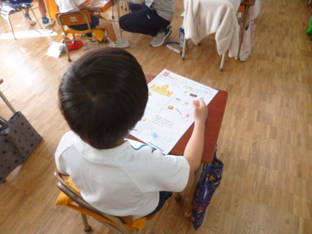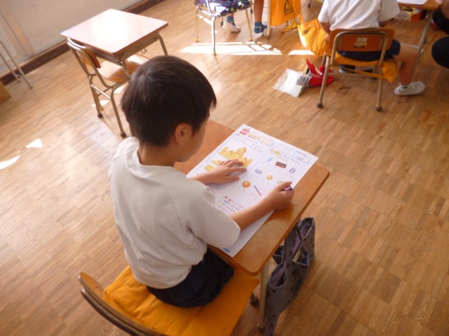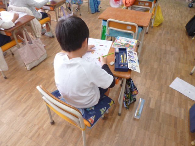 1年生算数の授業の様子です。「かたちあそび」のテストを行いました。どの子もとても真剣に取り組んでいました。はやく終わった子は、見直しもしていて、とても立派でした。