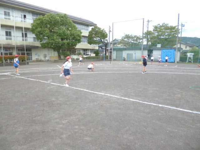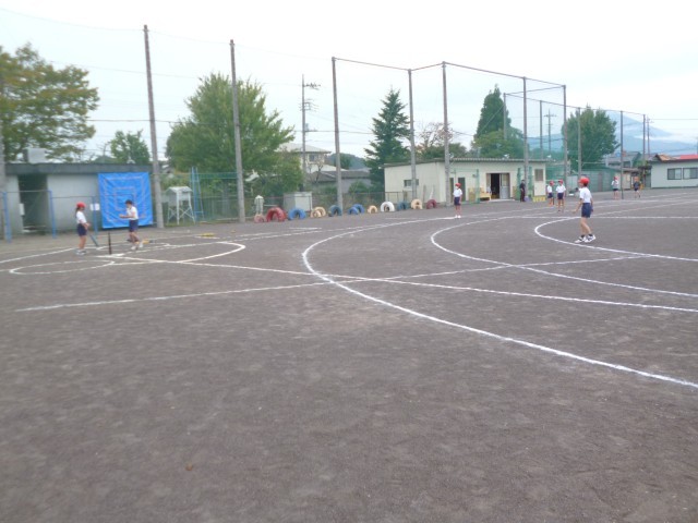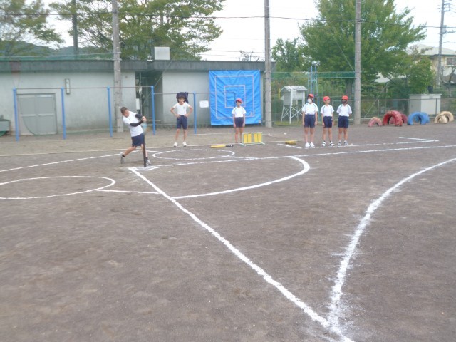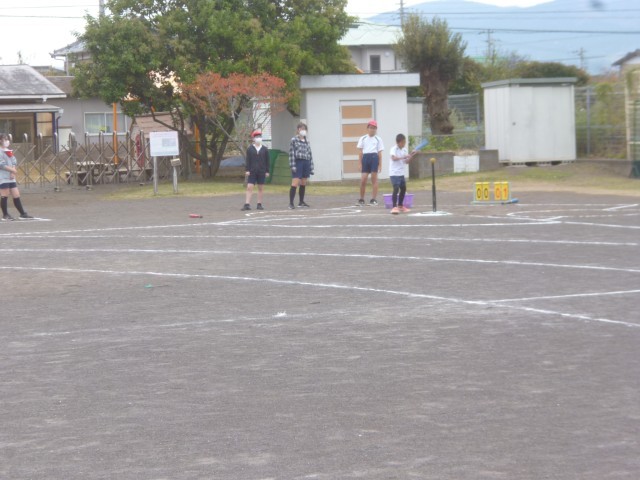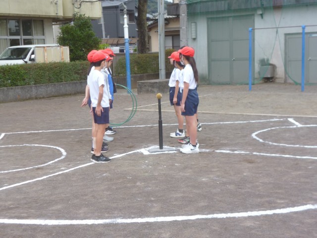 6年生体育の授業の様子です。ベースボール型ゲームで「Tボール」を行っています。最初にチームに分かれて、ボールを打つ練習や捕る練習をしました。その後、初めての試合をしました。初めての試合なので、ルールなどを確認しました。試合が進むにつれて、チームで話し合って作戦を決めながら試合をしている姿も見られました。