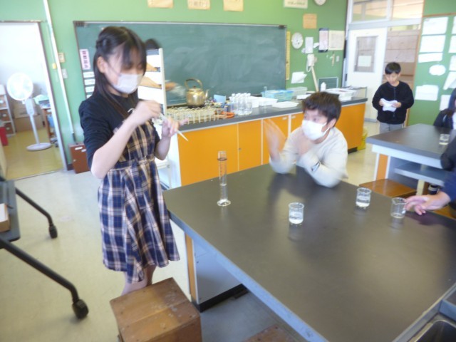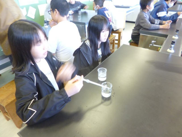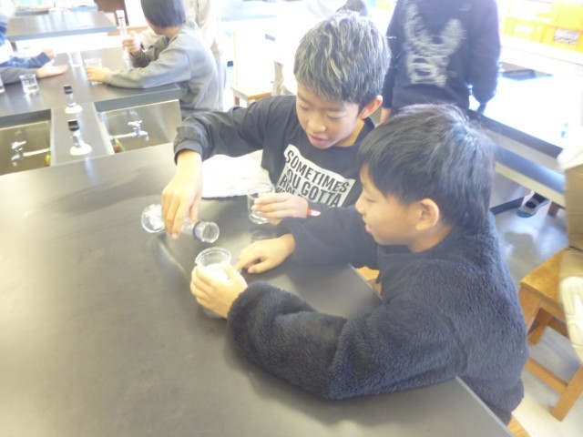 5年生理科「もののとけ方」の授業の様子です。前の授業で50ミリリットルに食塩がどのくらい溶けるのかの実験を行いました。その中で、溶け残った食塩が出ました。今回の授業では、「溶け残った食塩を溶かすにはどうしたらいいのだろうか」という課題に対して、水の量を100ミリリットルにしてみるということで、メスシリンダーで50ミリリットルを図って、ビーカーに水を足して実験を進めました。