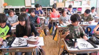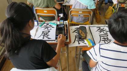 毛筆「発展」の学習が始まりました。はつがしらやたれの点画のつながりを意識して書きます。