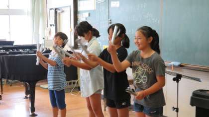 ハンドベルのチャイムで授業が始まりました。今日は、中学校の実習生も授業に来てくれました。