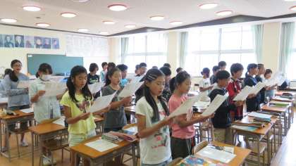 最初に、ガ行やハ行の発音に注意して「翼をください」を合唱し、歌のプレゼントをしました。「高音がきれいで、透明感のある歌声でした。」と、褒めていただきました。