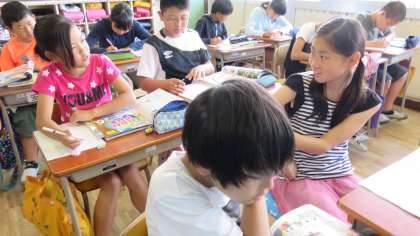 一生懸命、ノートや資料集などを見て、必要な情報を探しています。時には、友達と確認し合ったりもしています。