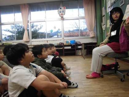 物語の内容に合わせて,12支を決める集まりに間に合わなかったネコのかぶり物をして,『12支のはじまり』を読み聞かせしてくれました。ありがとうございます。