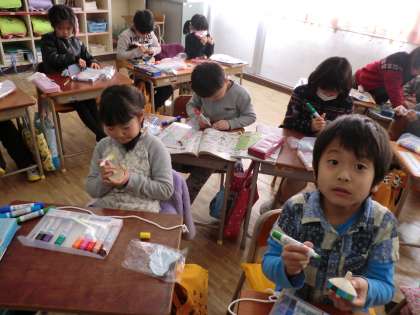 他にもいろいろ出てきた中で、今日は「こままわし」をやってみることにしました。まずはみんなでこまに色を付けました。