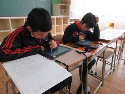 画用紙にまとめたり、模造紙にまとめたり、中にはタブレットにチャレンジしている子もいます。