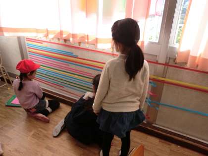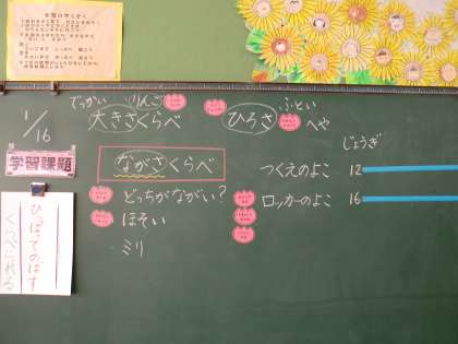 今日は「長さくらべ」をしました。離れたところに置いてある机とロッカーの長さが比べられなかったので、紙テープを使ってはかりました。その後、いろいろなものの長さを紙テープにうつして、壁にはりました。