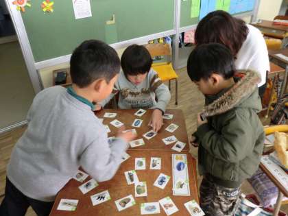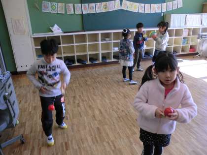 みんなで持ち寄った遊び道具を使って、ふゆのあそびをしました。初めての羽子板にとまどったり、かるたの読み札をすらすら読んだり、百人一首の坊主めくりを楽しんだりしました。また遊びましょう。