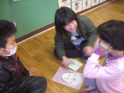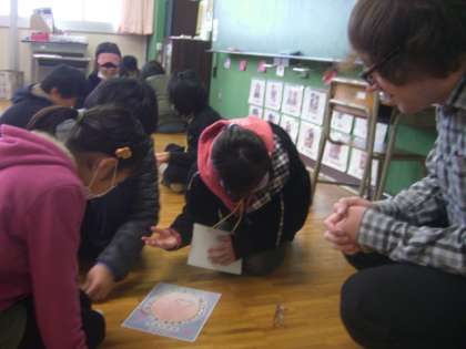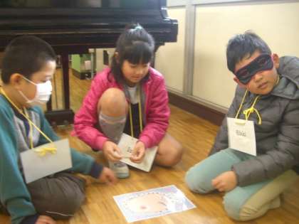 今日の英語では、お正月遊びの「福笑い」に挑戦しました。アップ、ダウン、ライト、レフトと方向を表す単語をヒントにしながら顔の部品を置いていきました。面白い表情のおかめとひょっとこができて、みんなも大笑いをしていました。今年もハッピーフェースがたくさん見られそうです。