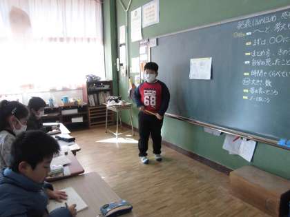 前回の発表者の良いところを取り入れて説明の技の腕を上げていました。また,発表を聴いた後で発表の良いところをたくさん見つけて,発表者に伝える子がいました。