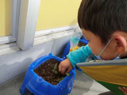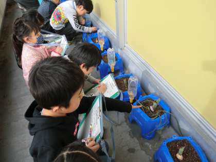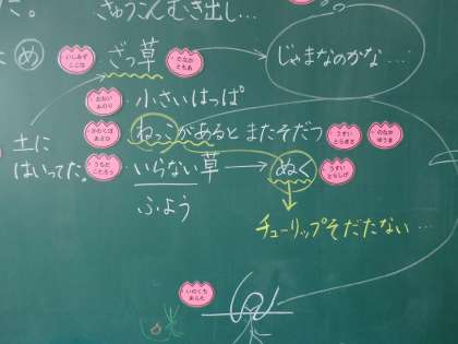 授業の前から観察していた子どもたち。何か気付いたことがあるか聞くと、「雑草が出ていた!」という話が・・・。雑草ってどんなものか、どうしたらいいのか、話し合って、「チューリップの栄養をとらないように、雑草は抜こう!」ということになりました。園後の観察では、みんな細かいところまでよく見ていました。
