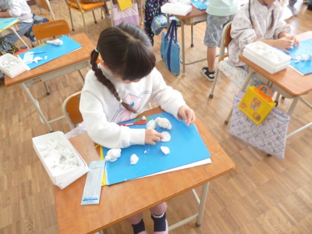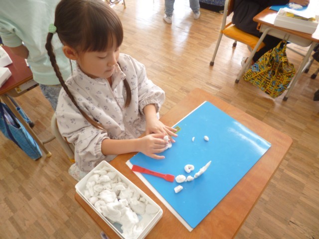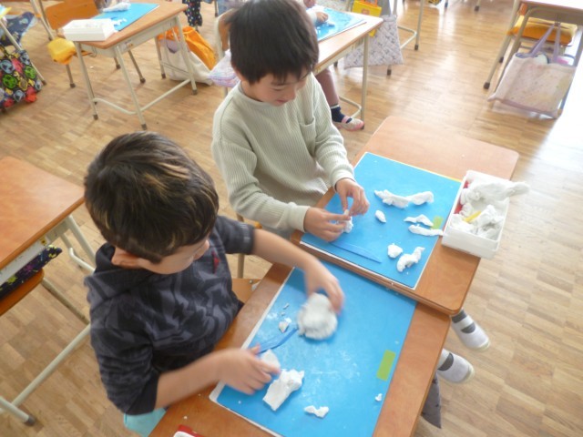 1年生図画工作科の授業の様子です。粘土を使って、自分の想像をひろげて作品を作りました。大きな作品をイメージしている子、細かいところまで丁寧に考えて作っている子、それぞれが自分のイメージした作品を一生懸命に作っていました。