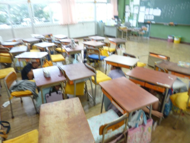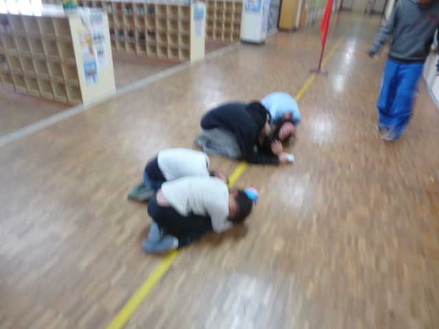 昼休みに避難訓練を実施しました。地震はいつ起こるか分からないので、今回は、事前に子どもたちに訓練のことは伝えずに行いました。休み時間に突然放送が流れ、子どもたちがどのように行動することができるのかも観察しました。教室にいた友達はしっかりと机の下に隠れ、廊下にいた子どもたちは、頭を隠しながら素早く座るなど、先生たちがいない中でも考えて行動する姿を見ることができました。